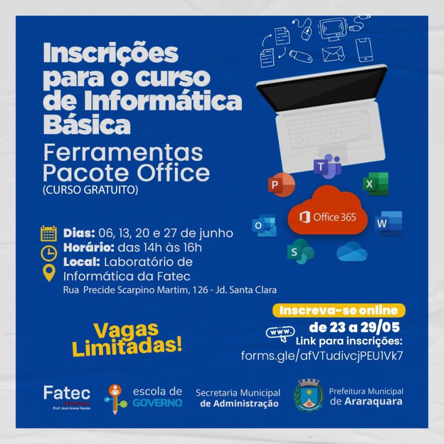 A Prefeitura de Araraquara, por meio da Escola de Governo do Município de Araraquara e a Secretaria Municipal de Administração, e a Faculdade de Tecnologia (Fatec), abriram as inscrições para o curso de informática básica (ferramentas do pacote Office), que será realizado nos dias 6, 13, 20 e 27 de junho, das das 14h às 16h no Laboratório de Informática da Fatec, que fica na Rua Precide Scarpino Martim, 126, Jardim Santa Clara.