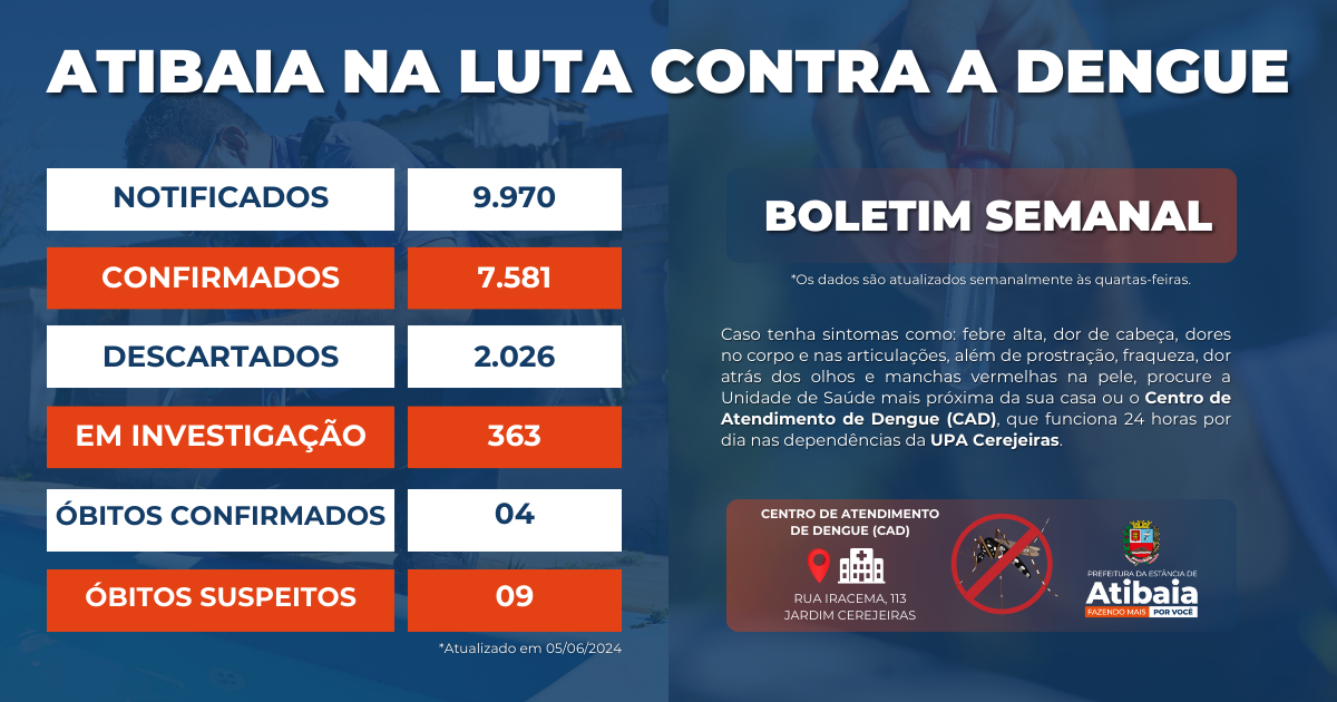 Devido ao aumento significativo dos casos de dengue, Atibaia tem intensificado as ações de combate ao mosquito Aedes aegypti, vetor da doença. Até esta quarta-feira (29), o município registrou 9.970 notificações, das quais 7.581 foram confirmadas, 2.026 descartadas e 363 estão em investigação. Três óbitos foram confirmados, totalizando quatro óbitos, enquanto outros nove estão sob análise.
