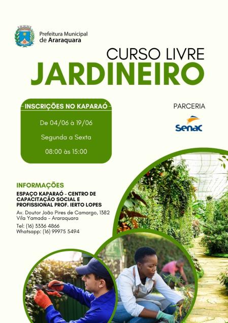 O Espaço Kaparaó, Centro de Capacitação Social e Profissional “Prof. Ierto Lopes”, ligado à Coordenadoria Executiva do Trabalho e de Economia Criativa e Solidária da Secretaria Municipal de Trabalho, Desenvolvimento Econômico e Turismo, está com inscrições abertas para 30 vagas no curso livre gratuito de Jardineiro, que será oferecido pelo Senac, em parceria com a Prefeitura de Araraquara.