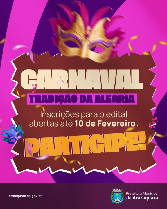 A Secretaria Municipal de Cultura e Fundart lançaram o edital de chamamento para celebração de apoio aos blocos carnavalescos de Araraquara para o “Carnaval 2025: Tradição da Alegria”. As inscrições devem ser efetuadas de 28 de janeiro a 10 de fevereiro, exclusivamente pelo e-mail [email protected].