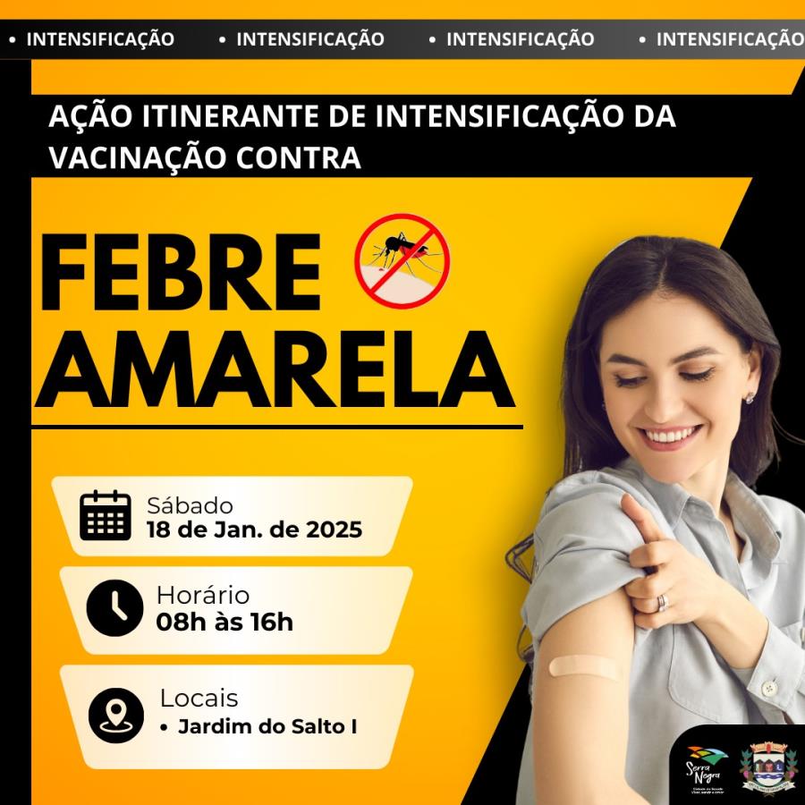 No sábado, 18 de janeiro, das 8h às 16h, uma equipe da Secretaria de Saúde da Prefeitura de Serra Negra percorrerá o Jardim do Salto I para realizar a vacinação contra a febre amarela. A iniciativa tem como objetivo imunizar pessoas que, por qualquer motivo, não conseguem se deslocar até uma unidade de saúde ou não estão devidamente informadas sobre os riscos da doença.