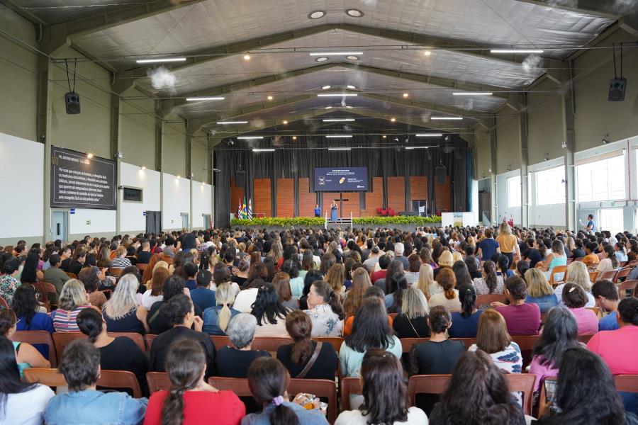 Profissionais da rede municipal de Educação participaram na manhã de sexta-feira (31) da cerimônia solene que marcou o início do novo ano letivo. O evento foi realizado na Primeira Igreja Batista de Atibaia (PIBA) e reuniu o prefeito, vice-prefeito, secretários municipais e servidores da Educação, divididos em dois turnos, cada um com cerca de mil profissionais. Estiveram presentes diretores, professores, auxiliares de sala e demais trabalhadores que atuam nas escolas, responsáveis pelo ensino de cerca de 16 mil estudantes que retornam às escolas no dia 4. Na abertura, os presentes assistiram à palestra de Irene Reis, da Reinventando Educação, com o tema “Cuidando da mente de quem transforma”, promovida para acolher e dar boas-vindas a todos os colaboradores da Educação de Atibaia.