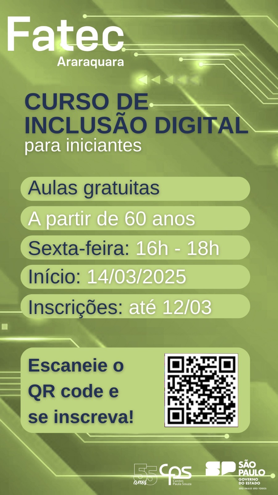 A Fatec Araraquara está com inscrições abertas para o curso “Inclusão Digital para Iniciantes”, voltado para pessoas com 60 anos de idade ou mais. As aulas terão início no dia 14 de março, sempre às sextas-feiras, das 16h às 18h, no laboratório de informática da Fatec.