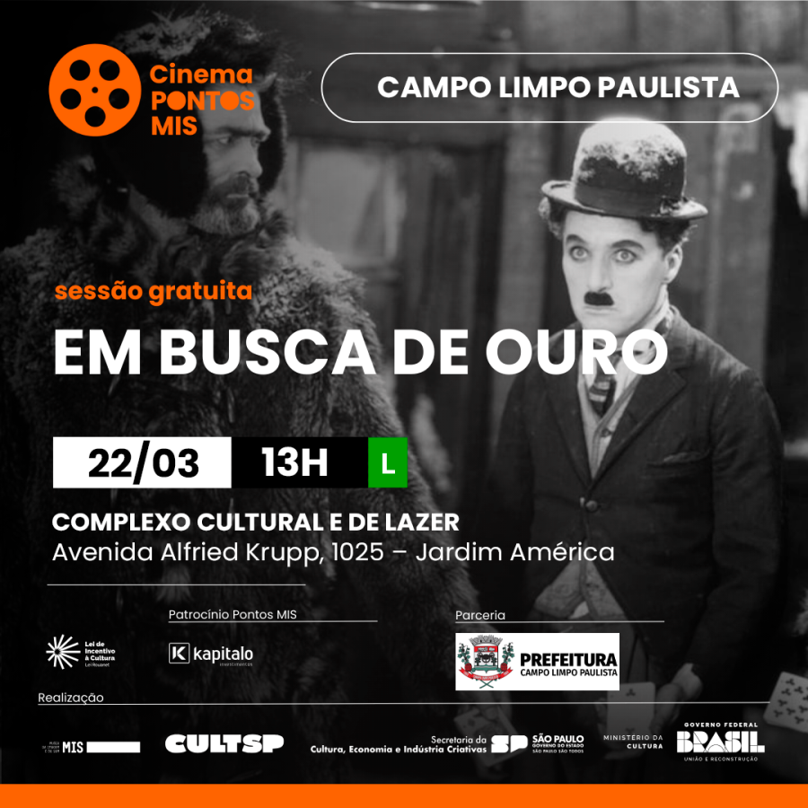 Além da oficina, no mesmo dia, às 13h, só que desta vez livre para todos, o CCL também contará com uma sessão cinema, que exibirá o filme “Em Busca do Ouro” (Livre) de 1925, marcando o último dia do Ponto MIS no mês de março. Também conhecido como “The Gold Rush”, o filme é uma das produções mais icônicas de Charlie Chaplin, tanto em termos de direção quanto de atuação.