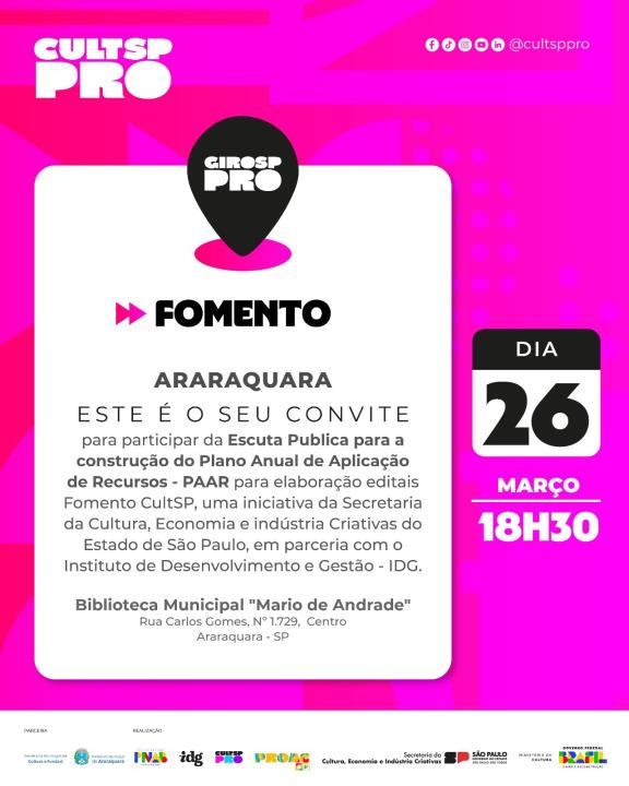 A Secretaria Municipal de Cultura e a Fundart realizam a Escuta Pública para a construção do PAAR – Plano Anual de Aplicação de Recursos, no próximo dia 26 de março, às 18h30, no auditório da Biblioteca Municipal Mário de Andrade. É aguardada a participação de artistas, produtores e agentes da área cultural de Araraquara e região, assim como interessados em geral.