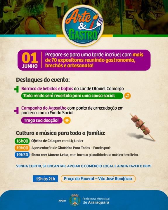 Artesanato, vinis, brechós, gastronomia e música vão tomar conta da Praça do Faveral, a Praça Roque José Hage, na Vila José Bonifácio, neste domingo (01), das 15h às 21h, com a realização da 1ª Feira Arte & Gastrô.