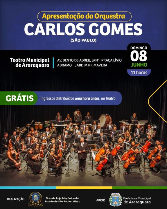 A Orquestra Sinfônica Carlos Gomes, de S. Paulo, fará uma apresentação especial em Araraquara no dia 08 de junho, domingo, às 11h da manhã, no Teatro Municipal Clodoaldo Medina. O concerto celebra os 97 anos da GLESP – Grande Loja Maçônica do Estado de São Paulo, realizadora do evento junto ao apoio da Secretaria municipal de Cultura e Fundart. A entrada é gratuita, com distribuição uma hora antes do concerto.