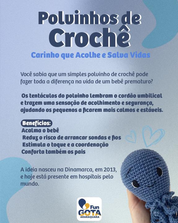 Pequenos brinquedos de crochê em formato de polvo funcionam como grandes aliados nos cuidados com recém-nascidos prematuros que precisam ficar internados na UTI neonatal. A iniciativa começou na Dinamarca, em 2013, e hoje já é aplicada em diversos países. Em Araraquara, a Maternidade Gota de Leite também adotou a ideia, graças ao trabalho de voluntários que confeccionam os bichinhos artesanalmente.