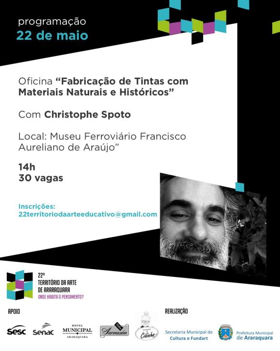 Ministrada pelo artista e pesquisador Christophe Spoto, a oficina propõe um mergulho na história da pintura por meio da produção artesanal de tintas feitas com terra, gema de ovo, goma-arábica e outros insumos simples. A proposta combina teoria e prática, abordando fundamentos físicos e químicos que sustentam técnicas tradicionais de pigmentação.