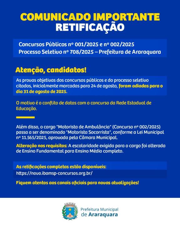 A Prefeitura Municipal de Araraquara informa que as provas objetivas dos Concursos Públicos nº 001/2025 e nº 002/2025, bem como do Processo Seletivo nº 708/2025, inicialmente previstas para o dia 24 de agosto de 2025, foram adiadas para o dia 31 de agosto de 2025. A alteração foi necessária para evitar conflito de datas com o concurso da Rede Estadual de Educação.