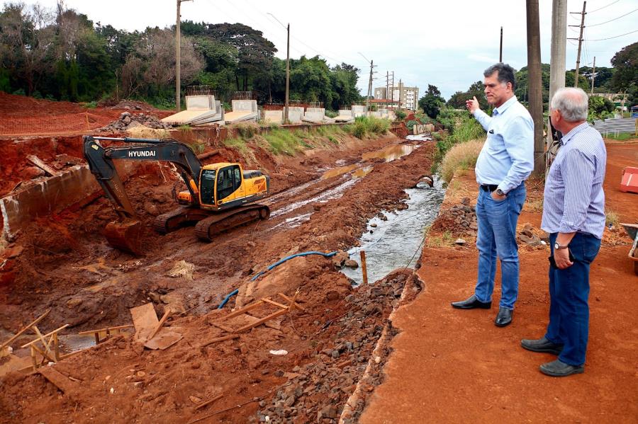 As obras de macrodrenagem no Córrego do Ouro seguem em ritmo acelerado. A construção da ponte na rua Carlos Gomes, no acesso ao Jardim dos Oitis, começou há 40 dias, e tem avançado com o estaqueamento, a base e o muro armado de sustentação das peças pré-moldadas do tabuleiro.
