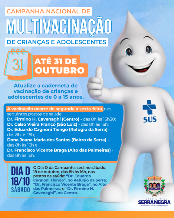 A Prefeitura de Serra Negra participa, até o dia 31 de outubro, da Campanha Nacional de Multivacinação 2025, iniciativa voltada à atualização da caderneta de vacinação de crianças e adolescentes de 0 a 15 anos. A ação tem como objetivo garantir que todos os planos vacinais estejam completos, prevenindo doenças e fortalecendo a imunidade coletiva.